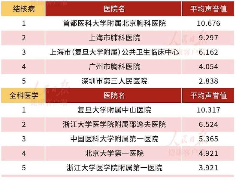 此外,健康时报还注意到,今年的榜单中还新增了“结核病”“全科医学”两专科的top5医院。其中,结核病科排名首位的医院为首都医科大学附属北京胸科医院,而全科医学科排名第一的则是复旦大学附属中山医院。(张萌)